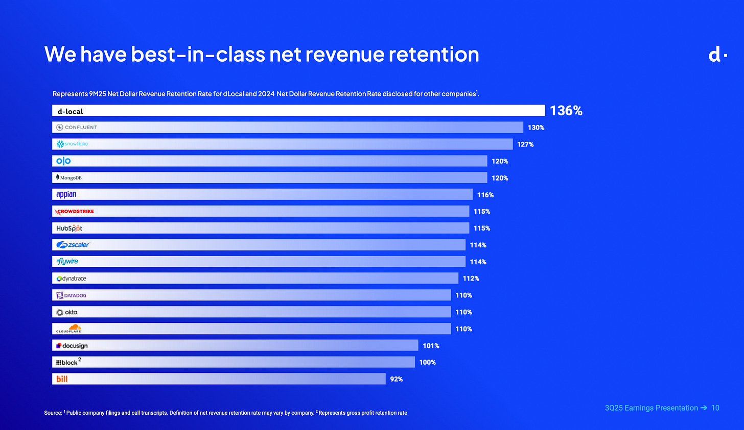 This has allowed the company to enjoy an industry leading 149% NRR, indicating that existing customers are increasing their spending with dLocal year after year by adding more products and launching in new countries.