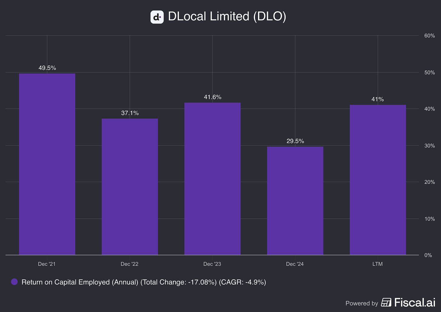 dLocal has an impressive average ROCE of 39% over the past 5 years. However, this ratio has shrunk from 50% in 2021 to 30% in 2024, mainly due to the company’s contracting net margin.