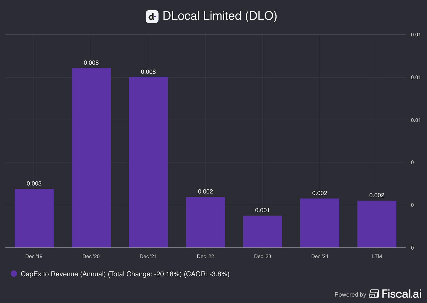 dLocal has consistently maintained a CAPEX ratio of under 3% of its revenue for the past 3 years, allowing them to be considered an asset-light business.