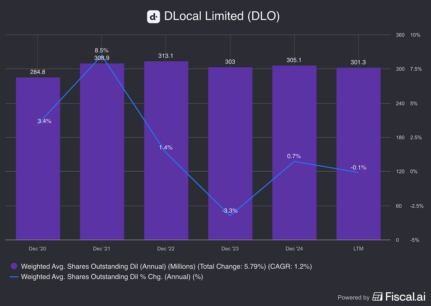 dLocal’s total shares outstanding slightly increased by 0.7% from 2023 to 2024, mainly caused due to its SBC, needed to retain top talent.