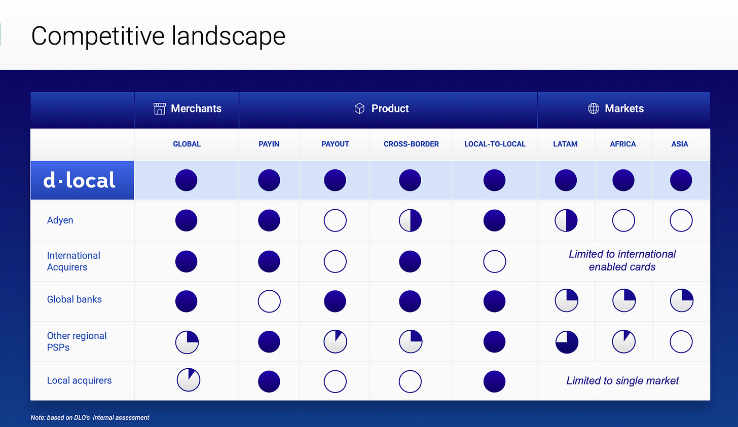 While technologies like blockchain and DeFi pose long-term potential, the company’s current competition comes from large global players investing to aggressively build out localized regulatory infrastructure to compete with dLocal’s offering.