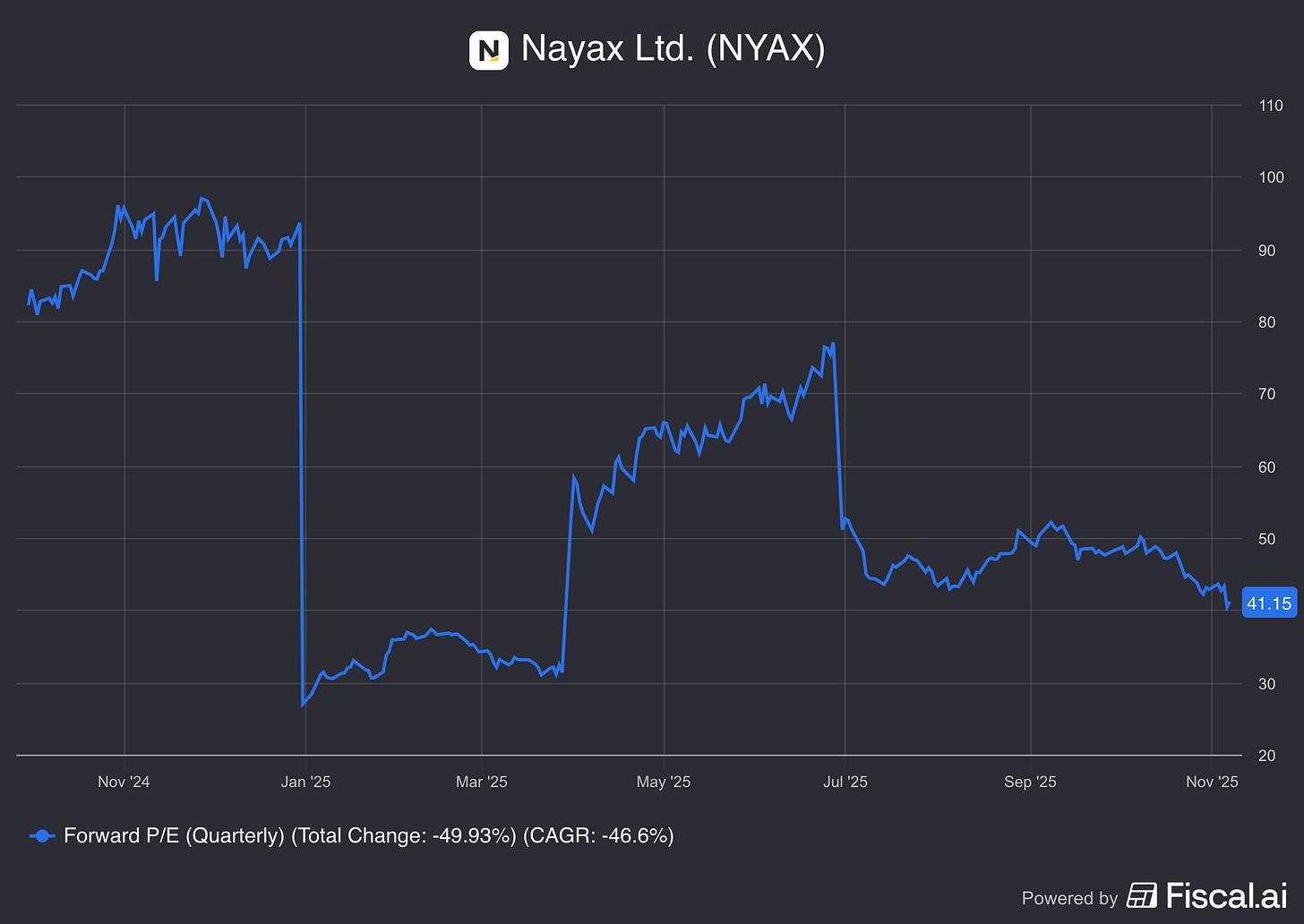 Nayax currently trades at a 41x forward P/E, which is much higher than other high-growth companies such as Toast (33.4), Adyen (36.1), or even Google (27.3).