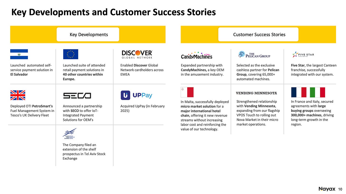 Most these funds were directly put to work into R&D and later that same year, Nayax acquired Weezmo, marking a strategic entry into the attended retail loyalty space, and the company launched Nayax Energy for EV charging solutions.